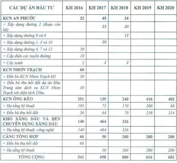 Bảng kế hoạch đầu tư giai đoạn 2016 - 2020 của Tin Nghia Corp (ĐVT: tỷ đồng)