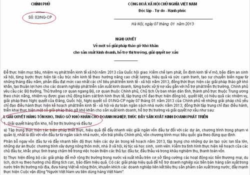 Tuy nhiên, nếu so sánh, đối chiếu lại Nghị quyết 02 của Chính phủ ngày 7/1/2013, có thể thấy ngay, mục đầu tiên trong văn bản đã nêu rõ: "I. GIẢI QUYẾT HÀNG TỒN KHO, THÁO GỠ KHÓ KHĂN CHO DOANH NGHIỆP, THÚC ĐẨY SẢN XUẤT KINH DOANH PHÁT TRIỂN" và mục "1. Giải quyết hàng tồn kho, hỗ trợ thị trường và đầu tư".