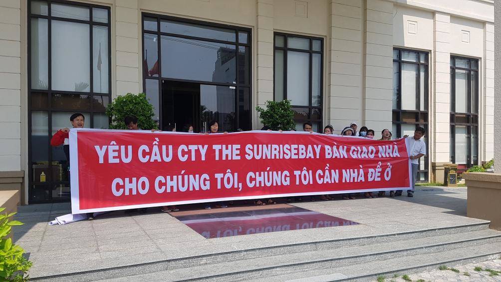 Sáng 2/10, hàng chục khách hàng mua nhà tại dự án The Sunrise Bay (quận Hải Châu, Đà Nẵng) tập trung tại Văn phòng bán hàng The Sunrise Bay, căng băng rôn yêu cầu chủ đầu tư bàn giao nhà.