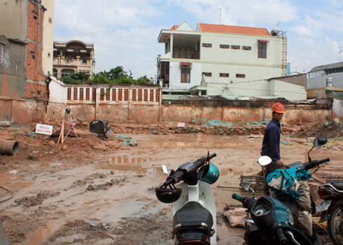 | Bên trong dự án Adonis 1 đang thi công phần tường vây nhưng không thấy có treo biển thông báo tên và các giấy phép của dự án. Ảnh: Vũ Lê. |
