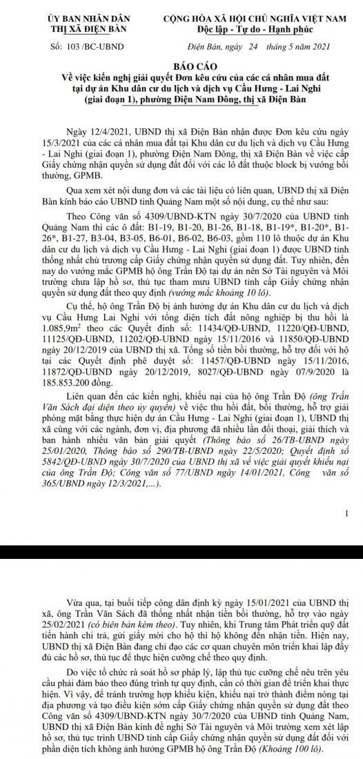 Đối với vấn đề này, UBND thị xã Điện Bàn cho biết, theo Công văn số 4309/UBND-KTN ngày 30/7/2020 của UBND tỉnh Quảng Nam thì các lô đất: B1-19, B1-20, B1-26, B1-18, B1-19*, B1-20*, B1- 26*, B1-27, B3-04, B3-05, B6-01, B6-02, B6-03, gồm 110 lô thuộc dự án Khu dân cư du lịch và dịch vụ Cầu Hưng - Lai Nghi (giai đoạn 1) được UBND tỉnh thống nhất chủ trương cấp Giấy chứng nhận quyền sử dụng đất.