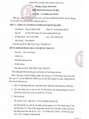 Theo phản ánh của anh Trần Anh Dũng, 36 tuổi, khách hàng mua căn hộ tại dự án Dream Town (nằm trên địa bàn xã Tây Mỗ - Từ Liêm – Hà Nội), đang trong giai đoạn nghiệm thu, thì khi đến bàn giao nhà mới phát hiện chủ đầu tư COMA6 đã tự ý thay đổi thiết kế căn hộ so với thỏa thuận trong hợp đồng mua bán.
