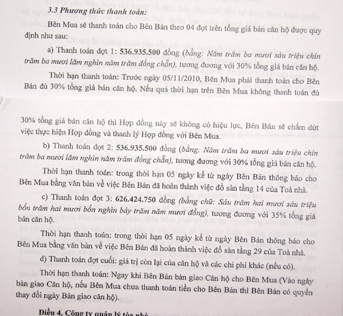 | Phần quy định các đợt thanh toàn tiền mua nhà được ký trong hợp đồng giữa nhà đầu tư thứ cấp với khách hàng, trong đó có khoản c là sai Luật. |