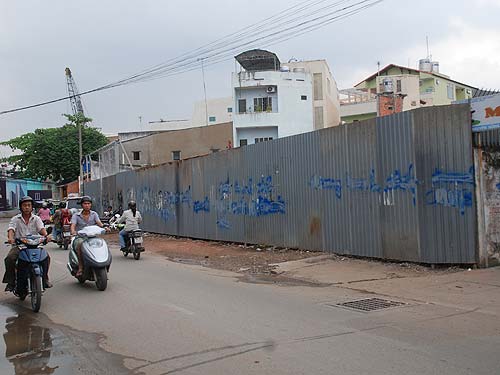 Nhiều khách hàng bức xúc đã viết các dòng chữ thóa mạ chủ đầu tư trên các tấm tôn bao quanh dự án The Adonis 1, số 31C Nguyên Hồng, quận Gò Vấp - TPHCM.