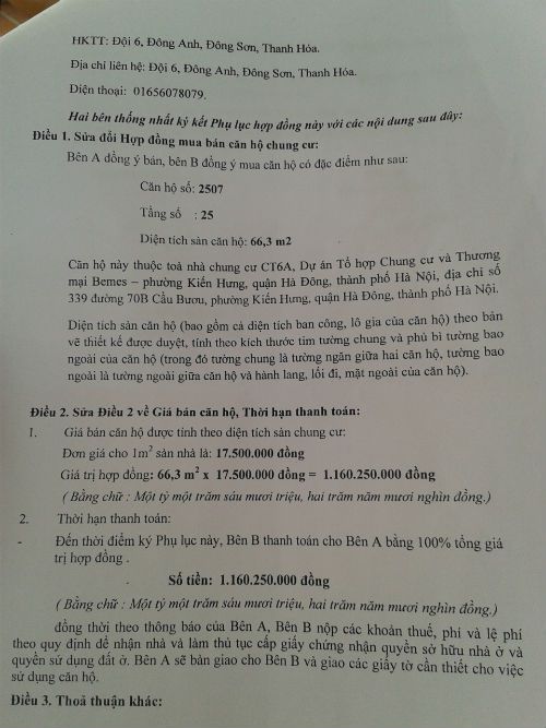 Chị Nguyễn Thị Thủy chủ một căn hộ ở CT6A cho biết, gia đình chị ký kết hợp đồng với chủ đầu tư mua căn hộ diện tích 66,3m2 với giá 21 triệu đồng/m2 vào 4/2011. Nhưng thời điểm giá nhà đất hạ, chủ đầu tư đã đồng ý bán với giá 17,5 triệu/m2 và yêu cầu mọi người ký vào phụ lục hợp đồng giảm giá tiền. Tuy nhiên vì có công việc không đến ký được phụ lục hợp đồng. Thời điểm tháng 5/2013 khi gia đình ký thì phụ lục đã thêm điều khoản vô lý về cách tính diện tích. Chủ đầu tư bắt buộc nếu không ký đồng ý các điều khoản của hợp đồng thì sẽ không được giảm giá và nhận nhà và cũng không thể làm đơn khiếu nại. Trước sức ép từ chủ đầu tư và không có sự lựa chọn nào khác gia đình chị đã buộc phải ký và theo đó chị phải trả gần 40 triệu đồng cho hơn 2m2 diện tích chung.
