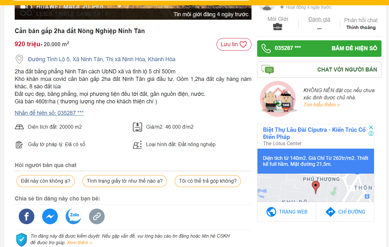 Trên trang Chợ tốt, giá đất nông nghiệp tại Khánh Hòa được rao bán với giá rất rẻ, chỉ từ vài chục ngàn đồng/m2. Đơn cử, một mảnh đất 20.000 m2 ở xã Ninh Tân, thị xã Ninh Hòa được rao với giá 46.000 đồng/m2. Diện tích mảnh đất này gồm 1,2 ha đất trồng cây hàng năm và 8 sào đất trồng lúa. Chủ nhân mảnh đất cho biết, do ảnh hưởng của Covid-19 nên cần bán gấp. Đất cực đẹp, bằng phẳng, mọi phương tiện đều tới đất, gần nguồn điện, nước...