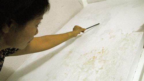 Theo ghi nhận của chúng tôi, hiện phần trần nhà căn hộ không còn thấm nước, nhưng tại hai góc căn phòng nước ngấm thành vệt, có nơi xuất hiện những đốm vàng chạy dọc từ trần nhà xuống sàn. Gia đình bà K.A. quá mệt mỏi khi phải sống trong tình cảnh như vậy suốt thời gian qua.