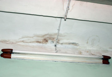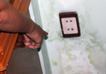 Trần nhà và ổ điện trên tường nhà bà Anh thấm nước mưa loang lổ. Ảnh: T.HIỂU