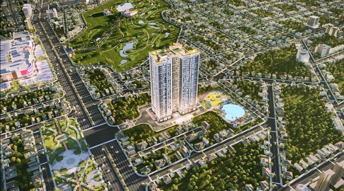 Quy mô dự án gồm 6 block cao 19 tầng nổi và 1 tầng hầm, cung 95 căn shophouse và 2.000 căn hộ đa dạng diện tích từ 43-90m2