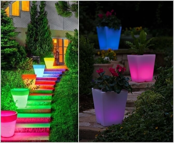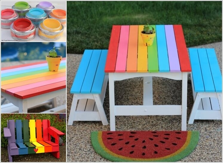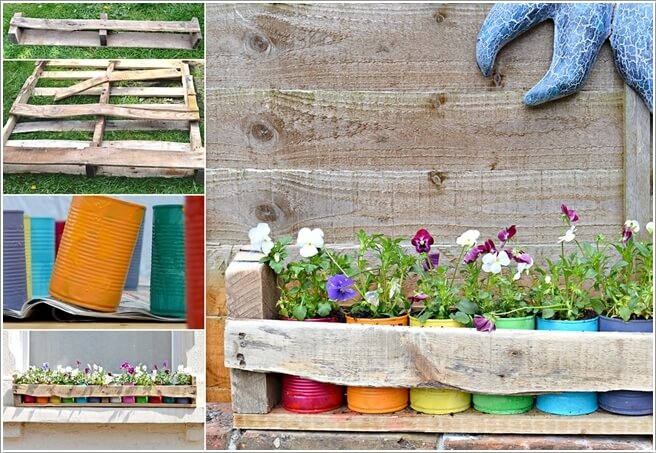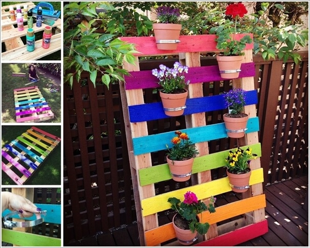 Sử dụng những thanh gỗ, sơn màu sắc và đóng thành kệ đựng những chậu hoa đặt trong khu vườn.