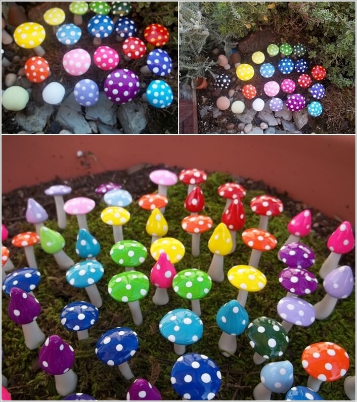 Tạo hình những chiếc nấm nổi bật một góc vườn, tạo không khí vui tươi chào đón mùa xuân.