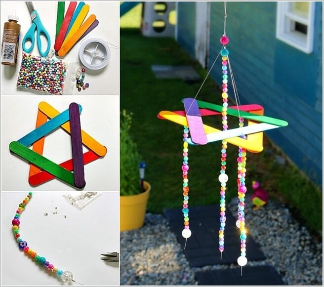Một chiếc chuông gió lung linh được tạo ra từ những que kem và hạt màu nhựa màu sắc.
