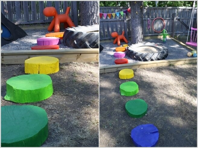 Khu vui chơi của bé trong vườn, bạn cũng có thể tạo đường đi độc đáo bằng những gốc cây màu sắc.