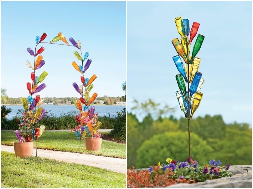 Hay bạn có thể tái sử dụng những chai nhựa, thủy tinh màu sắc tạo điểm nhấn cho lối vào khu vườn.