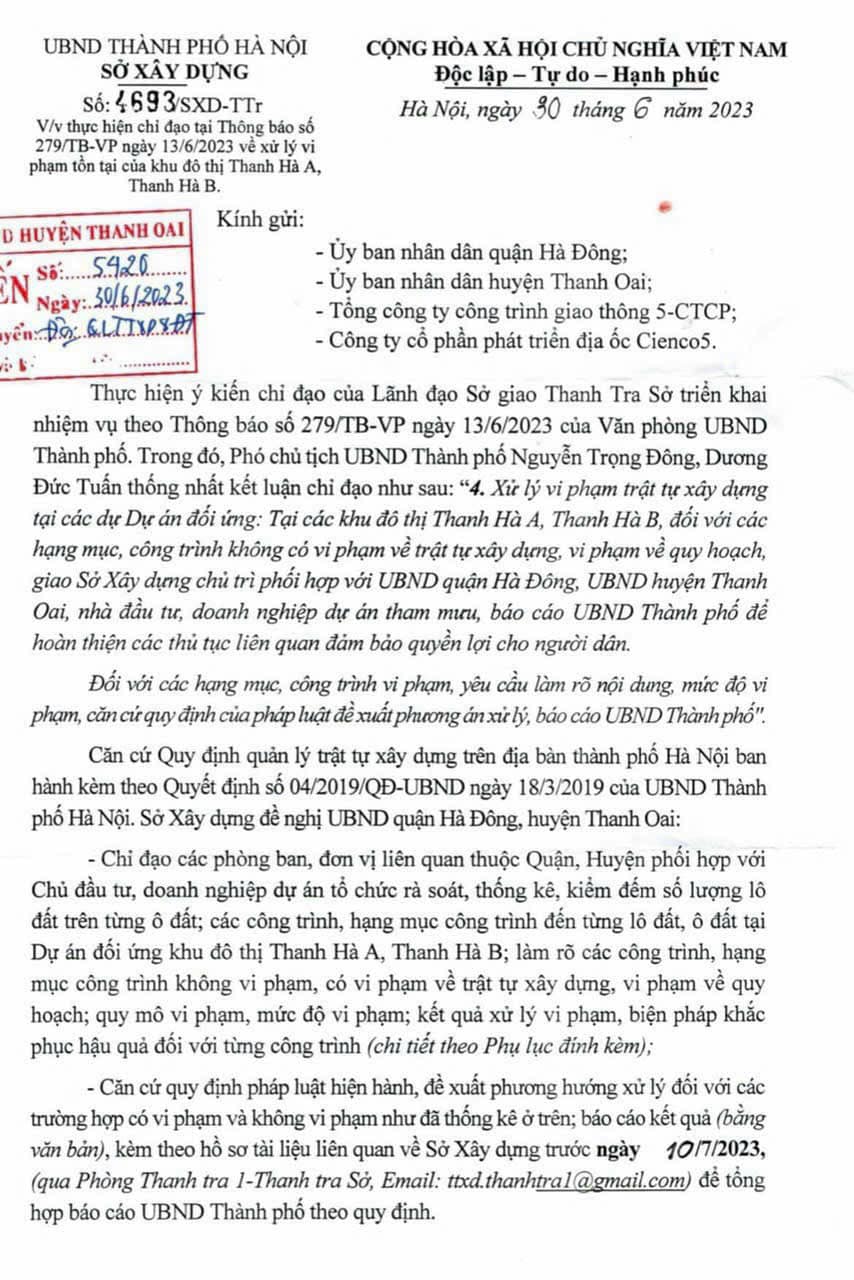 Sở Xây dựng Hà Nội vừa có văn bản gửi UBND quận Hà Đông, UBND huyện Thanh Oai, Tổng công ty công trình giao thông 5 – CTCP và Công ty Cổ phần phát triển địa ốc Cienco5 về việc xử lý vi phạm của khu đô thị Thanh Hà A, Thanh Hà B.