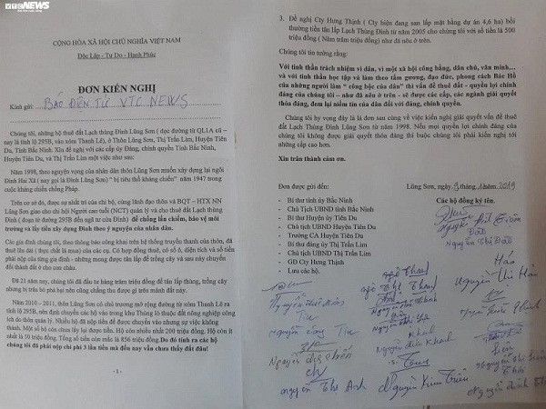 Đơn kiến nghị của các hộ dân thôn Lũng Sơn.