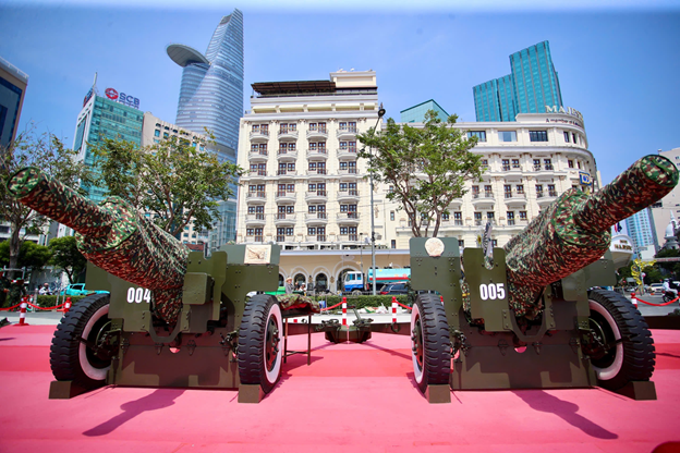 Các khẩu đại bác loại nòng 105mm, nặng khoảng 4 tấn, xếp thành hàng dài, nòng pháo hướng về phía Khu đô thị mới Thủ Thiêm bên kia sông Sài Gòn.