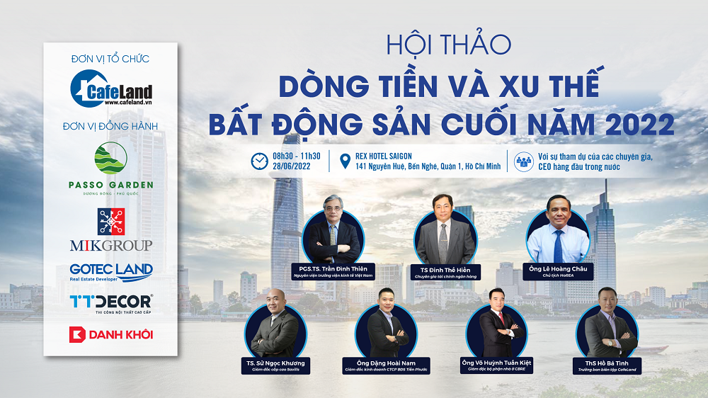 | Vào sáng ngày 28/6 sắp tới, CafeLand sẽ tổ chức buổi hội thảo với chủ đề “Dòng tiền và xu thế bất động sản cuối năm 2022” tại khách sạn Rex Sài Gòn, 141 Nguyễn Huệ, Bến Nghé, Quận 1, TP.HCM. Hội thảo có sự tham gia của các chuyên gia: - PGS.TS Trần Đình Thiên - Chuyên gia kinh tế, Thành viên tổ tư vấn Chính phủ, Nguyên Viện trưởng Viện Kinh tế Việt Nam - TS. Đinh Thế Hiển - Chuyên gia Tài chính - Ông Lê Hoàng Châu - Chủ tịch Hiệp hội BĐS TP.HCM (HoREA) - TS. Sử Ngọc Khương - Giám đốc cấp cao Savills Việt Nam - Ông Đặng Hoài Nam - Giám đốc kinh doanh Công ty CP BĐS Tiến Phước - Ông Võ Huỳnh Tuấn Kiệt - Giám đốc bộ phận nhà ở CBRE - ThS. Hồ Bá Tình - Trưởng phòng nội dung CafeLand |