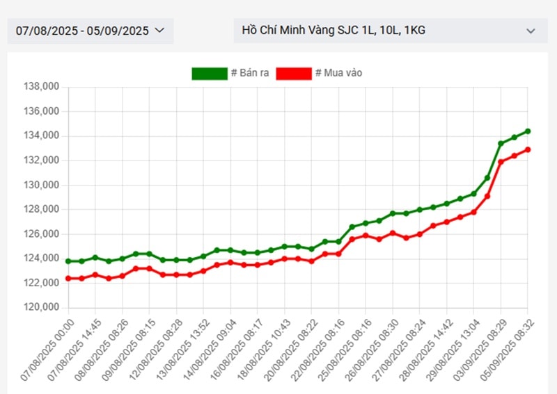 Trong nước, giá vàng phiên ngày 5/9 cũng ghi nhận các mốc đỉnh của đỉnh. Vàng miếng SJC 1L, 1KG khép phiên ở giá bán ra 134,4 triệu đồng/ lượng. Giá vàng nhẫn SJC 5C vẫn quanh 134,42 triệu đồng/ lượng; vàng nhẫn 4 số 9 giao dịch sát 130 triệu đồng/ lượng. Chênh lệch giữa giá mua và giá bán tùy thương hiệu, vẫn giữ ở khoảng 2,5-3 triệu đồng/ lượng. Ước tính trong vòng 30 ngày, vàng miếng SJC đã tăng xấp xỉ 9%; vàng nhẫn có mức tăng thấp hơn khoảng 4,27%.