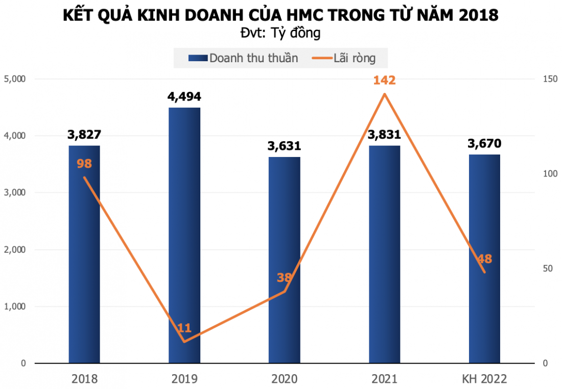 Theo đó, công ty dự định chia cổ tức năm 2021 bằng tiền mặt tỷ lệ 45%, tức mỗi cổ phiếu sẽ nhận được 4.500 đồng/cp. Cụ thể, HMC sẽ phải chi ra hơn 94 tỷ đồng để chia cổ tức tiền mặt. Đồng thời, công ty sẽ chia cổ tức bằng cổ phiếu với tỉ lệ 30%.
