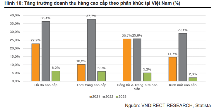Theo VnDirect dù vẫn còn ở giai đoạn sơ khởi nhưng thị trường xa xỉ Việt Nam dự kiến sẽ tăng trưởng đáng kể nhờ sự gia tăng của tầng lớp người dân thu nhập cao ngày càng có nhu cầu lớn hơn đối với các mặt hàng xa xỉ.