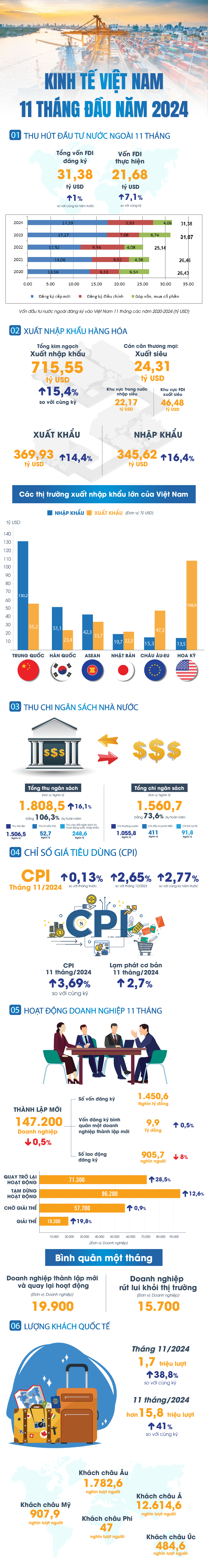 Bức tranh kinh tế Việt Nam 10 tháng đầu năm 2024 với nhiều khởi sắc khi xuất khẩu tăng mạnh, cán cân thương mại tiếp tục xuất siêu 23,31 tỷ USD; vốn đầu tư nước ngoài thực hiện đạt 19,58 tỷ USD, khách quốc tế tăng mạnh so với cùng kỳ,... theo số liệu mới công bố của Tổng cục Thống kê.