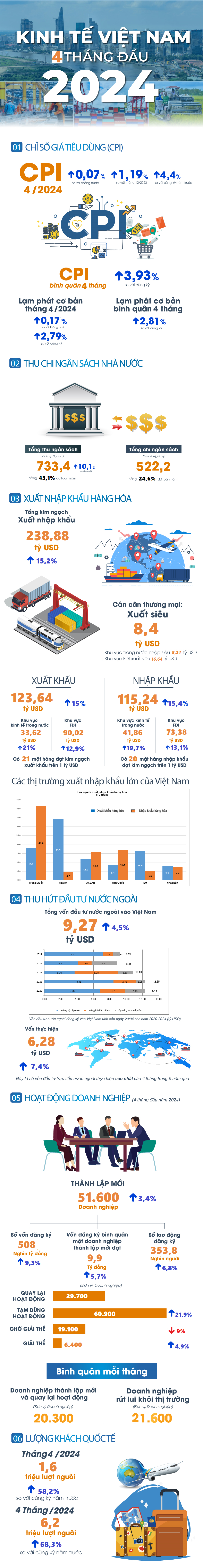 Bức tranh kinh tế Việt Nam trong quý đầu tiên năm 2024 ghi nhận nhiều dấu hiệu hồi phục với GDP đạt 5,66%, cao nhất trong vòng 4 năm qua; xuất khẩu tiếp đà tăng giúp duy trì cán cân xuất siêu hơn 8 tỷ USD; vốn FDI tăng; đón hơn 4,6 triệu khách quốc tế,... theo số liệu mới công bố của Tổng cục Thống kê.