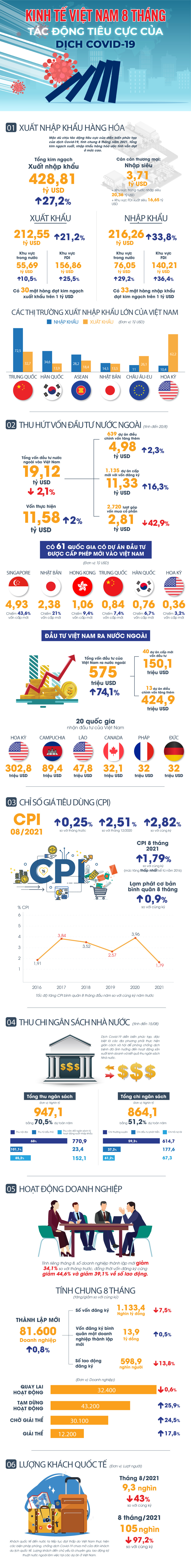 Diễn biến phức tạp của dịch bênh, nhiều tỉnh, thành trên cả nước thực hiện giãn cách, đã ảnh hưởng tiêu cực đến hoạt động xuất nhập khẩu của Việt Nam trong 8 tháng qua. Mặc dù tổng kim ngạch xuất nhập khẩu hàng hóa đạt vẫn đạt mức cao nhưng thâm hụt thương mại ước tính lên tới 3,71 tỷ USD và là tháng thứ 4 liên tiếp Việt Nam ghi nhận tình trạng nhập siêu.