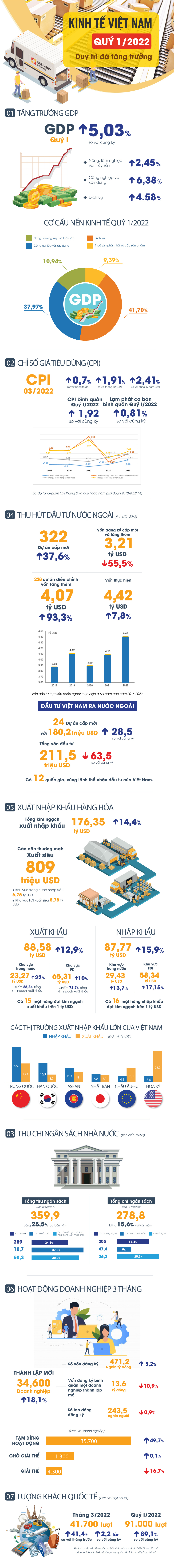 Kinh tế Việt Nam trong quý đầu tiên năm 2022 ghi nhận sự khởi sắc khi tăng trưởng GDP đạt 5,03%, hoạt động xuất nhập khẩu duy trì được cán cân thặng dư, số lượng doanh nghiệp thành lập mới tăng mạnh,... theo số liệu mới công bố của Tổng cục Thống kê.