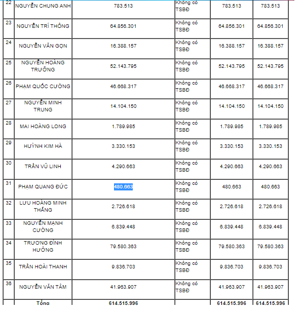 Giá trị ghi sổ khoản nợ gồm tiền gốc, lãi và lãi phạt. Tổng giá trị 36 khoản nợ này là 614,5 triệu đồng.