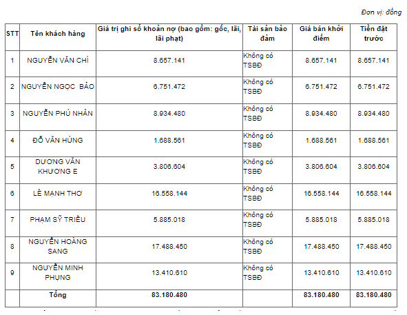 Ngày 21/7, ngân hàng này ra thông báo rao bán khoản nợ vay tiêu dùng của 36 cá nhân với những món vay có giá trị từ nhỏ nhất là 480.663 đồng, cho đến những món nợ giá trên 1 triệu đồng, cao nhất là 79,5 triệu đồng.