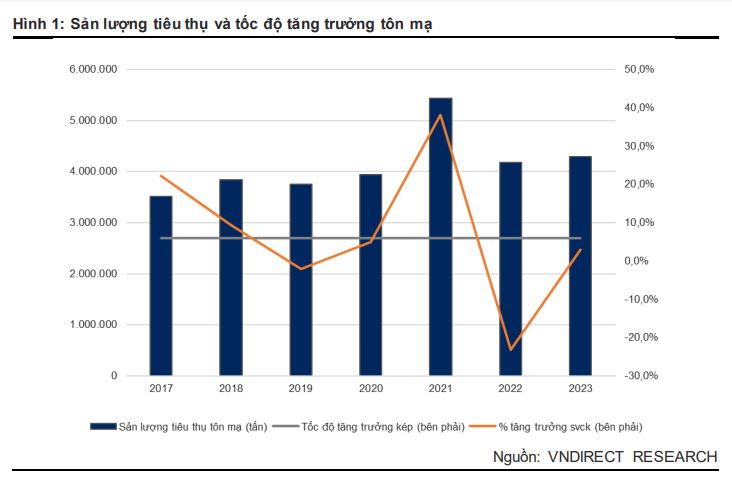 Đối với mảng tôn mạ, VnDirect cho biết nhu cầu tăng trưởng ổn định từ 2016-2023 với sản lượng tiêu thụ tăng trưởng với tốc độ tăng trưởng kép là 6%.