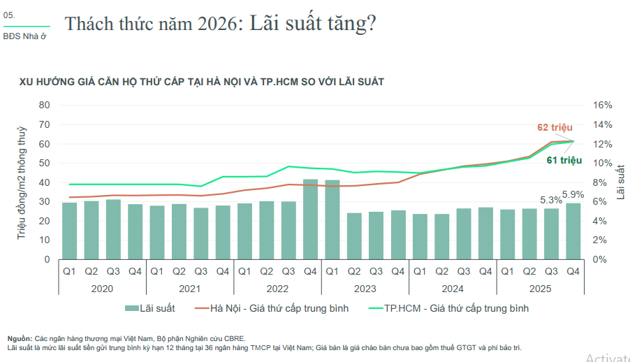 Báo cáo CBRE cho thấy bất động sản vẫn duy trì sức hút thực tế dù lãi suất biến động. Cụ thể năm 2025, giá căn hộ thứ cấp tại TP.HCM tăng mạnh khoảng 24-28%, tại Hà Nội khoảng 24%. Trong khi đó, giá nhà thấp tầng tại TP.HCM tăng khoảng 17% trên thị trường thứ cấp. Tỷ lệ hấp thụ toàn thị trường đạt trên 70%, quý 4/2025 thậm chí lên 83-90% ở một số phân khúc.
