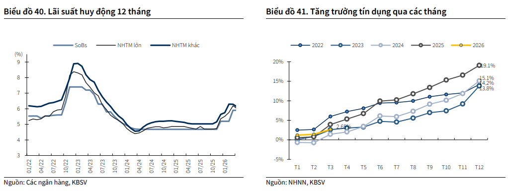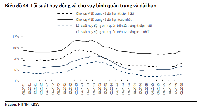 KBSV thống kê, lãi suất huy động kỳ hạn 12 tháng của toàn hệ thống tăng 71 điểm cơ bản (bps) so với cuối năm 2025. Trong đó, nhóm ngân hàng quốc doanh đã tăng khoảng 70 bps, còn nhóm ngân hàng tư nhân lớn tăng mạnh hơn, khoảng 100-110 bps.