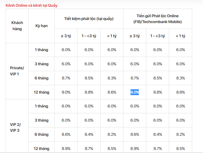 Techcombank tăng mức lãi suất niêm yết cho tiền gửi tiết kiệm lên đến 9%/năm cho khoản tiền gửi từ 3 tỷ đồng trở lên, kỳ hạn 12 tháng.