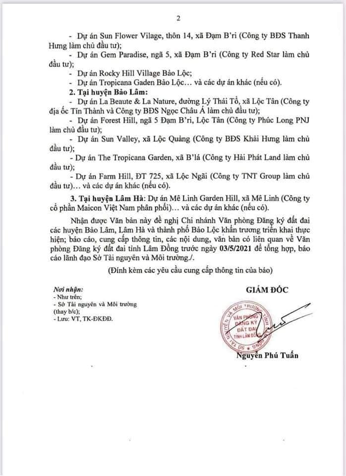 19 dự án được nêu tên trong văn bản của Văn phòng đăng ký đất đai TP.Bảo Lộc