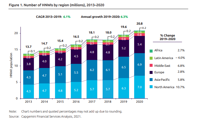 Số lượng các cá nhân có giá trị tài sản ròng cao (* tài sản có thể đầu tư từ 1 triệu USD trở lên) tính theo khu vực từ năm 2013-2020 (Nguồn: Capgemini 2021