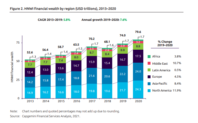 Lợi nhuận từ thị trường chứng khoán đã giúp hàng ngũ dân số có giá trị ròng cao trên toàn cầu tăng 6,3%, vượt ngưỡng 20 triệu người, trong khi khối tài sản HNWI tăng 7,6% vào năm 2020, gần đạt 80 nghìn tỷ USD.