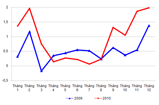 2010, mức tăng CPI đã vượt qua 1%. Các tháng từ 9 đến 11, chỉ số giá