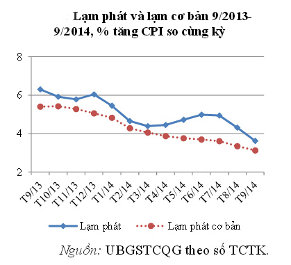 Theo Ủy ban giám sát tài chính quốc gia, lạm phát cơ bản vẫn trong xu hướng giảm kể từ 1 năm qua và giảm xuống còn 3,12% trong tháng 9/2014 so với cùng kỳ. Lạm phát tiếp tục được giữ ổn định ở mức thấp trong hơn 2 năm qua.