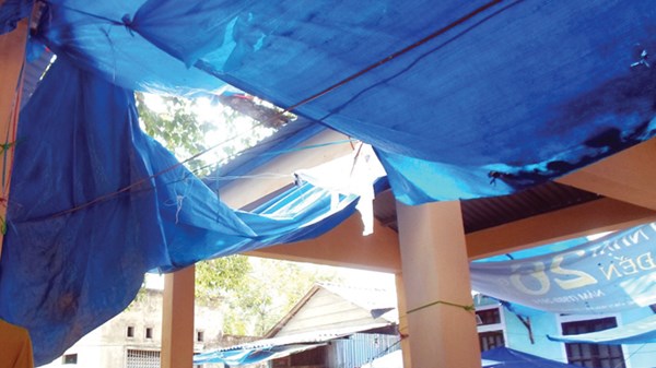 Người dân phải “vá chằng vá đụp” thêm tấm lợp mới có thể tạm ngồi buôn bán trong chợ mới ở Phú Mỹ. Ảnh: Ngọc Văn
