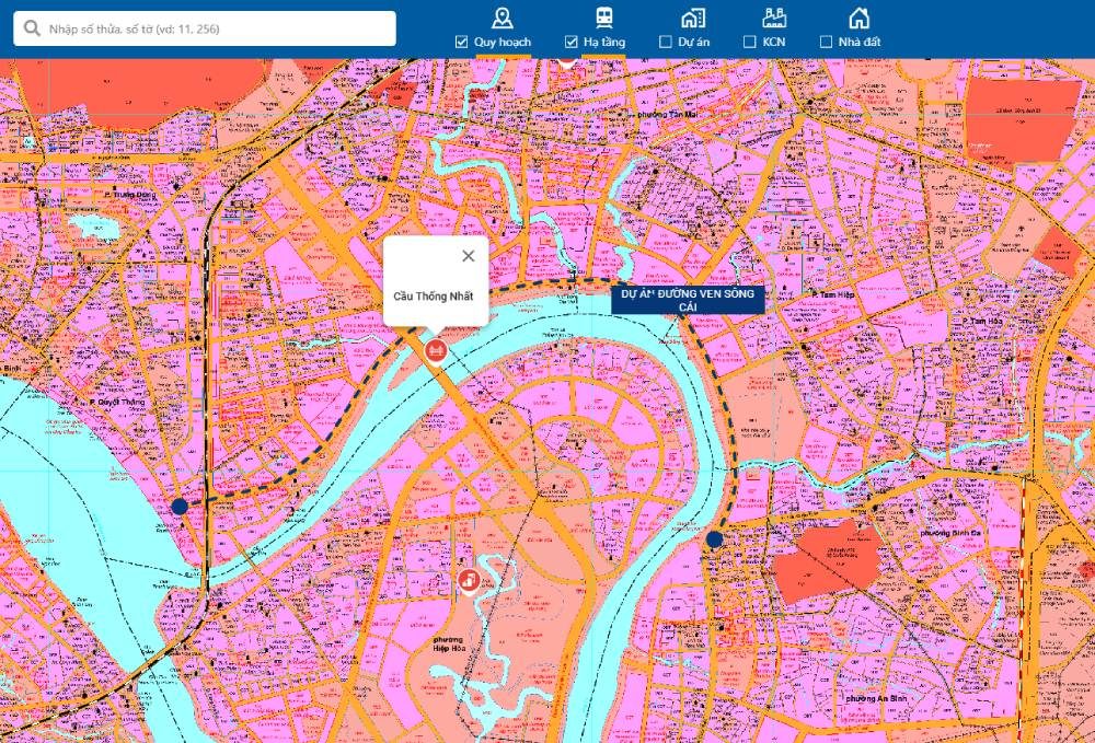 Dự án đầu tư xây dựng đường trục trung tâm Biên Hòa, (phường Trấn Biên, tỉnh Đồng Nai), đoạn từ đường Võ Thị Sáu đến đường Đặng Văn Trơn, gồm các hạng mục cầu Thống Nhất và đường kết nối 2 đầu cầu có tổng mức đầu tư hơn 1.500 tỷ đồng.