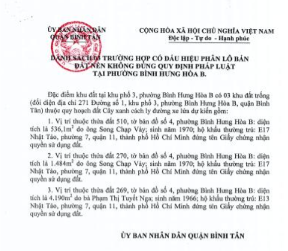 Qua kiểm tra, rà soát, UBND quận Bình Tân (TP.HCM), cho biết, hiện nay trên địa bàn phường Bình Hưng Hoà B đang có 3 khu đất trống quy hoạch đường xe lửa dự kiến, hiện nay đang chuẩn bị sang nhượng cho ông Đ.Đ.Đ (sinh năm 1979, thường trú ở phường Bình Hưng Hoà A, quận Bình Tân) khả năng khi sang nhượng 3 bãi đất trống này ông Đ. sẽ tiến hành phân lô, bán nền trên mạng xã hội (phân thành 67 nền).