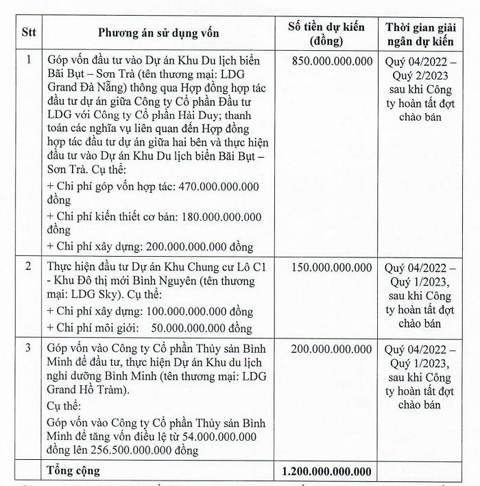 Với 1.200 tỷ đồng thu được từ đợt chào bán, LDG dự kiến sử dụng 850 tỷ đồng để góp vốn đầu tư vào dự án Khu Du lịch biển Bãi Bụt – Sơn Trà (LDG Grand Đà Nẵng) thông qua Hợp đồng hợp tác đầu tư dự án giữa LDG với Công ty CP Hải Duy.