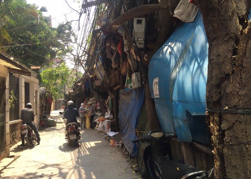 Hơn thế, hằng ngày, tiếng cưa đục “giải phẫu” đồ đạc, tiếng đập vỏ lon kim loại vang lên chát chúa, quần áo cũ giăng mắc khắp nơi và treo lơ lửng phía trên đầu người đi đường, gây mất mỹ quan đô thị.