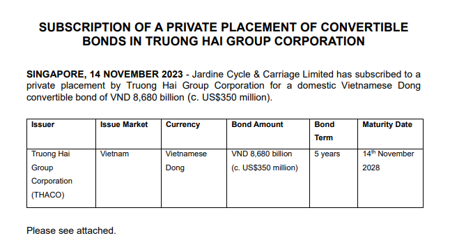Theo công bố của Jardine Cycle & Carriage (JC&C), tập đoàn này đã tham gia vào đợt phát hành lô trái phiếu chuyển đổi TCOCH2328001 với giá trị 8.680 tỷ đồng, tương đương 350 triệu USD mà Thaco vừa phát hành.
