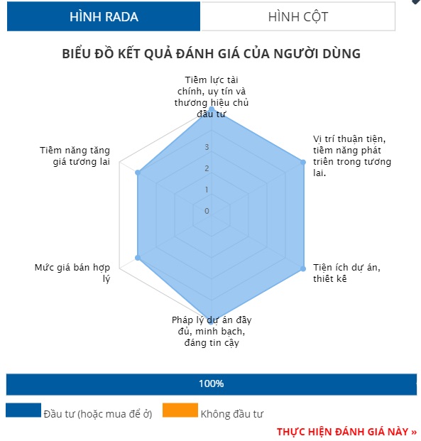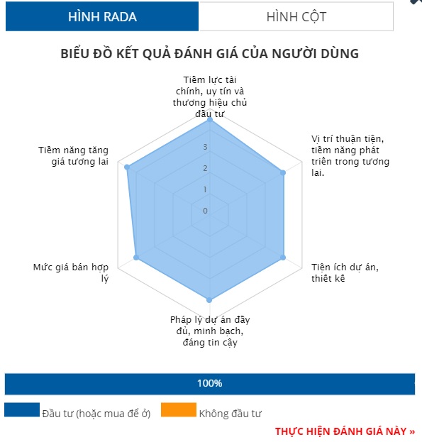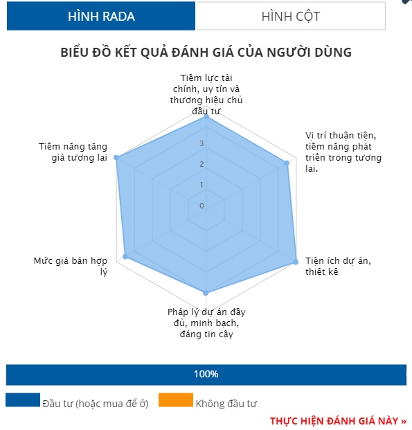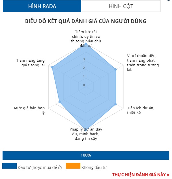 Nhìn vào biểu đồ, dù không có tiêu chí nào đạt điểm tuyệt đối, nhưng các tiêu chí đánh giá đều cao. Cụ thể, uy tín chủ đầu tư và tiềm năng đạt 4,5/5. Các tiêu chí còn lại bao gồm vị trí, tiện ích, pháp lý và giá bán đều đạt 4/5 điểm.