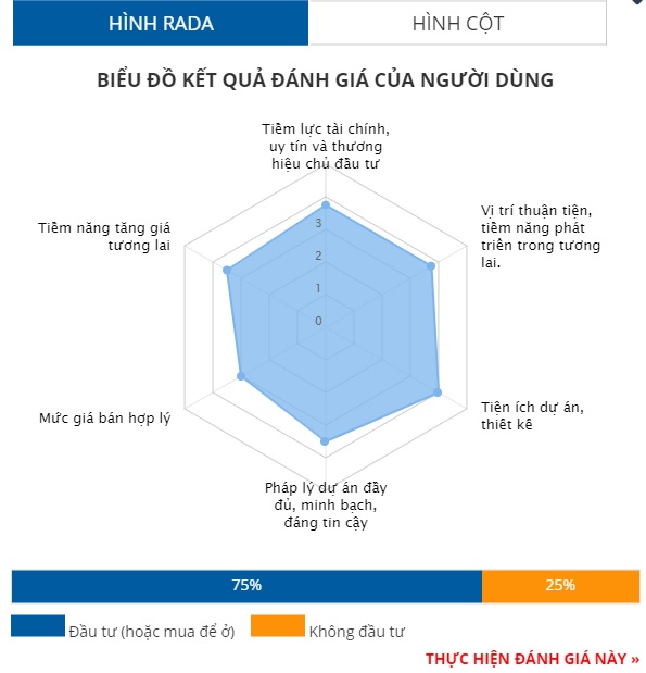 Biểu đồ cho thấy, các tiêu chí đánh giá dự án có sự chênh lệch khi tiêu chí tiềm lực, pháp lý đạt 5/5, trong khi đó tiêu chí mức giá chỉ đạt 3,5/5. Các tiêu chí còn lại đều được độc giả đánh giá ở thang điểm 4.
