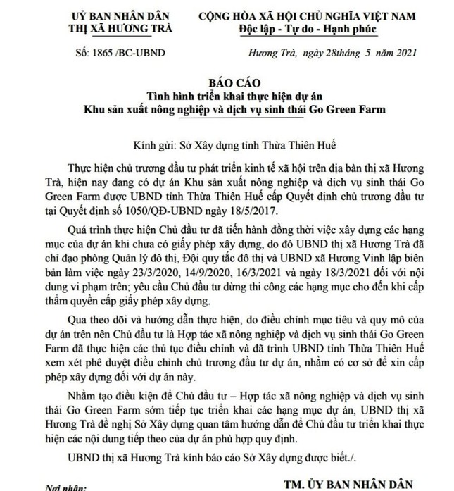 Nhằm tạo điều kiện để chủ đầu tư là Hợp tác xã nông nghiệp và dịch vụ sinh thái Go Green Farm sớm tiếp tục triển khai các hạng mục dự án, UBND thị xã Hương Trà đề nghị Sở Xây dựng quan tâm hướng dẫn để chủ đầu tư triển khai thực hiện các nội dung tiếp theo của dự án phù hợp quy định” (trích Báo cáo 1865 của UBND thị xã Hương Trà).