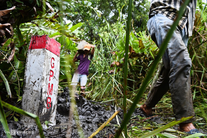 Công nhân đi cắm cọc Vành đai 3, năm 2022. Ảnh: Thanh Tùng